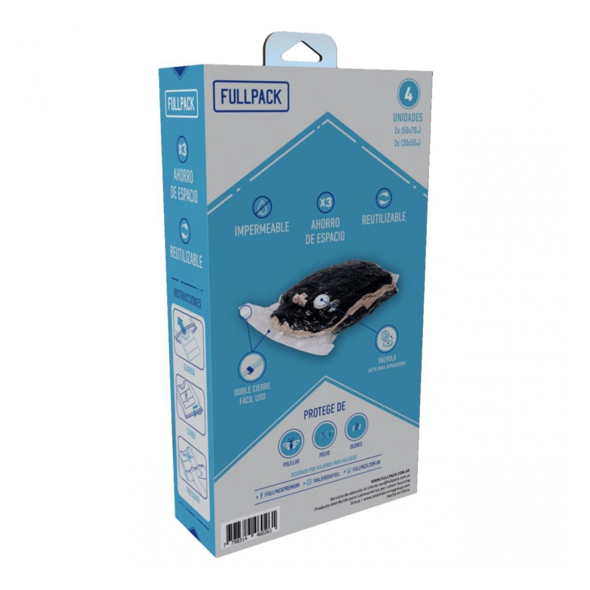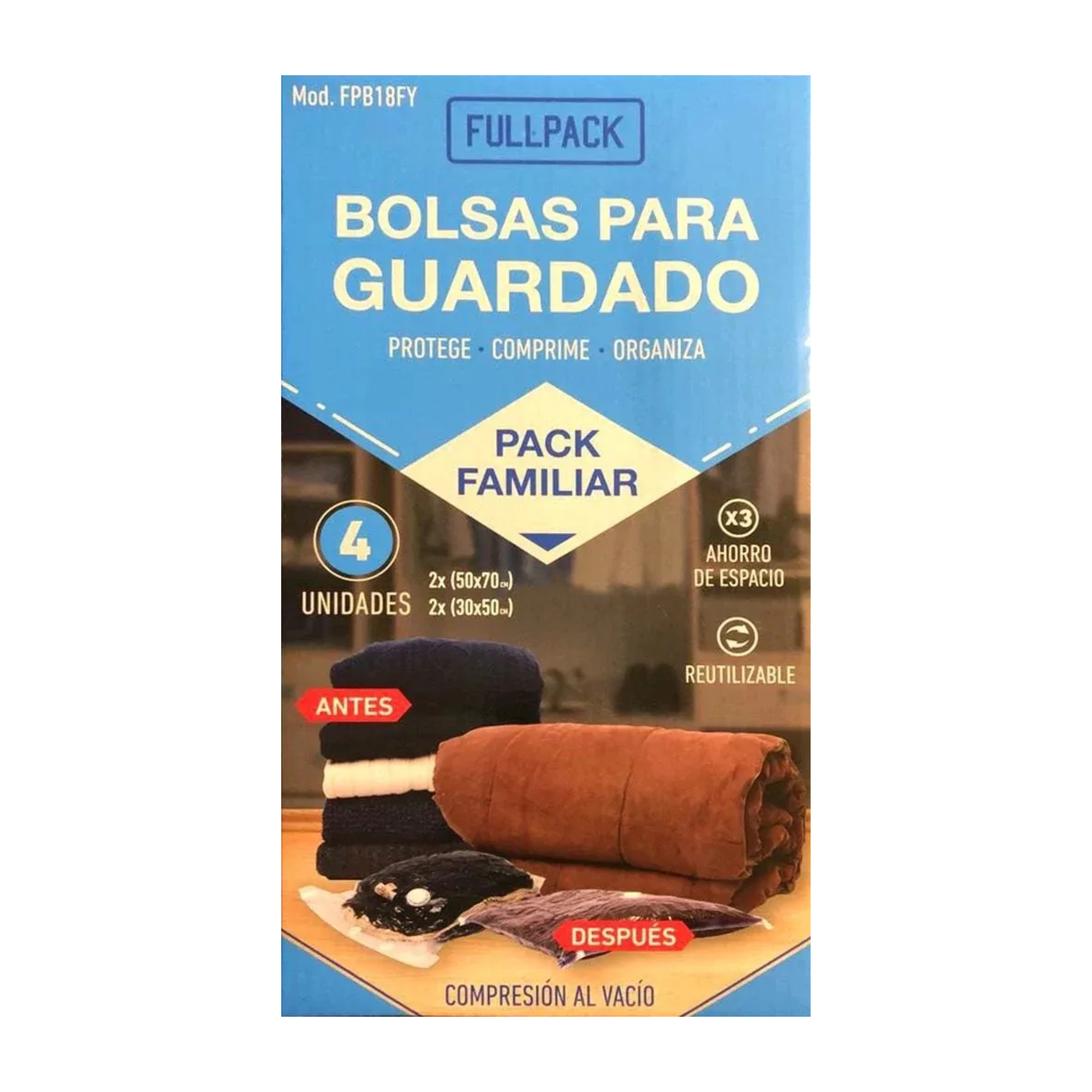 Bolsas de guardado al vacío FULL PACK. Incluye 4 unidades: 2 de 50 x 70 cm y 2 de 30 x 50 cm, con pico para extraer el aire, cierre hermético y uso reutilizable.