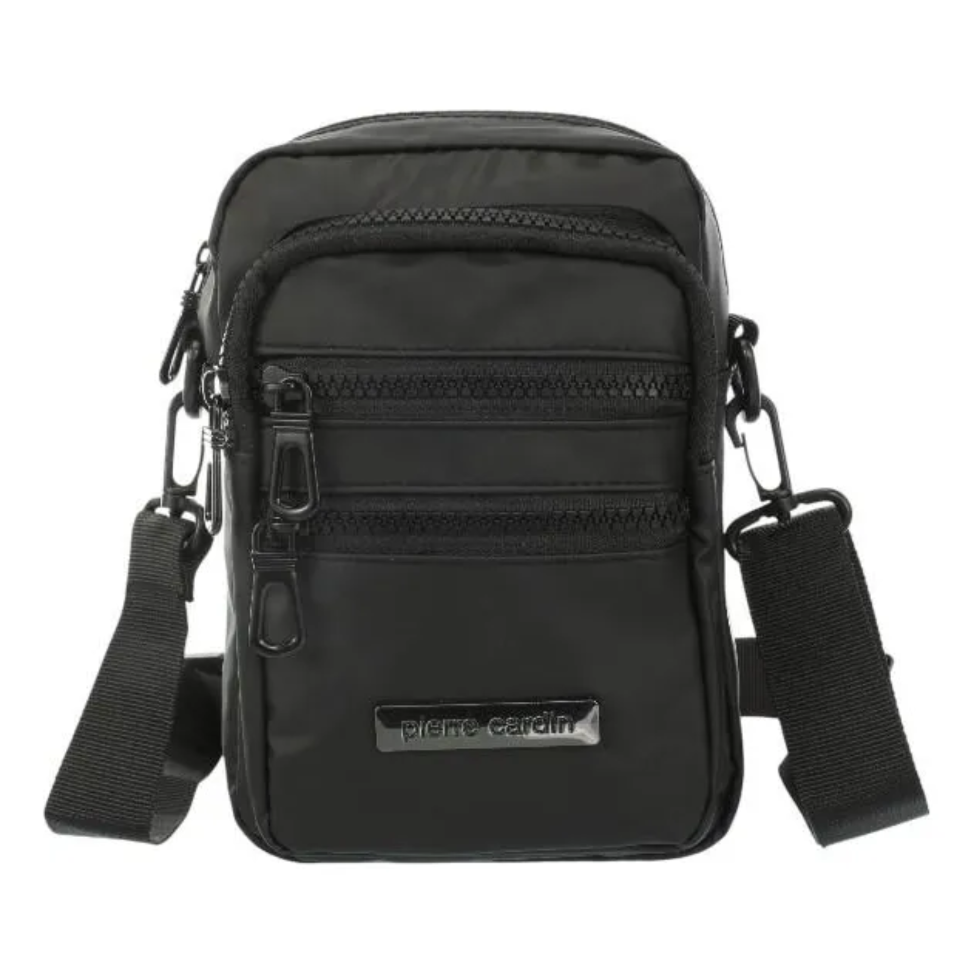 Morral engomado PIERRE CARDIN impermeable, práctico y versátil. Cuenta con bolsillo frontal, correa regulable, pasador para usar como riñonera y gancho interno para llaves. Ideal para uso diario y viajes.