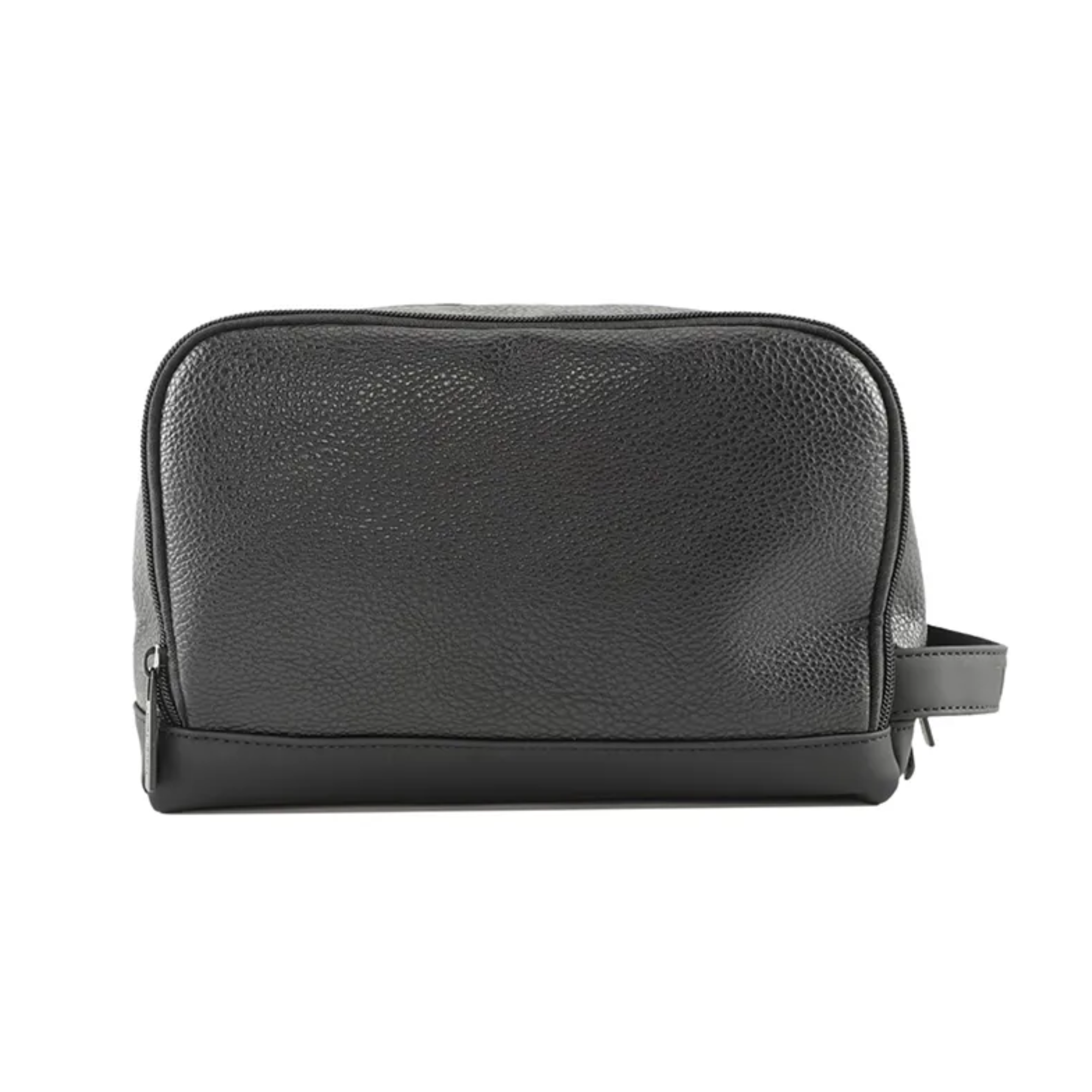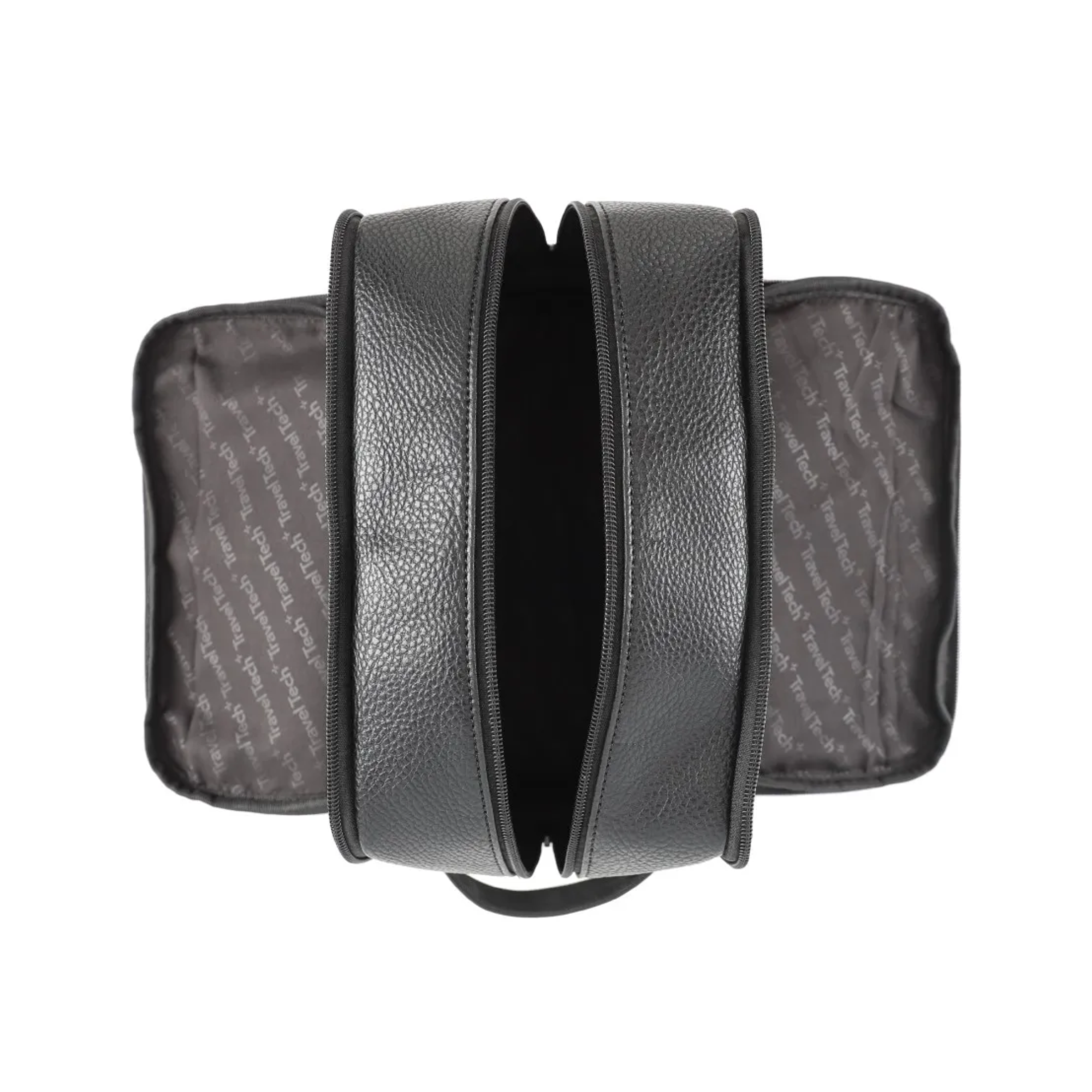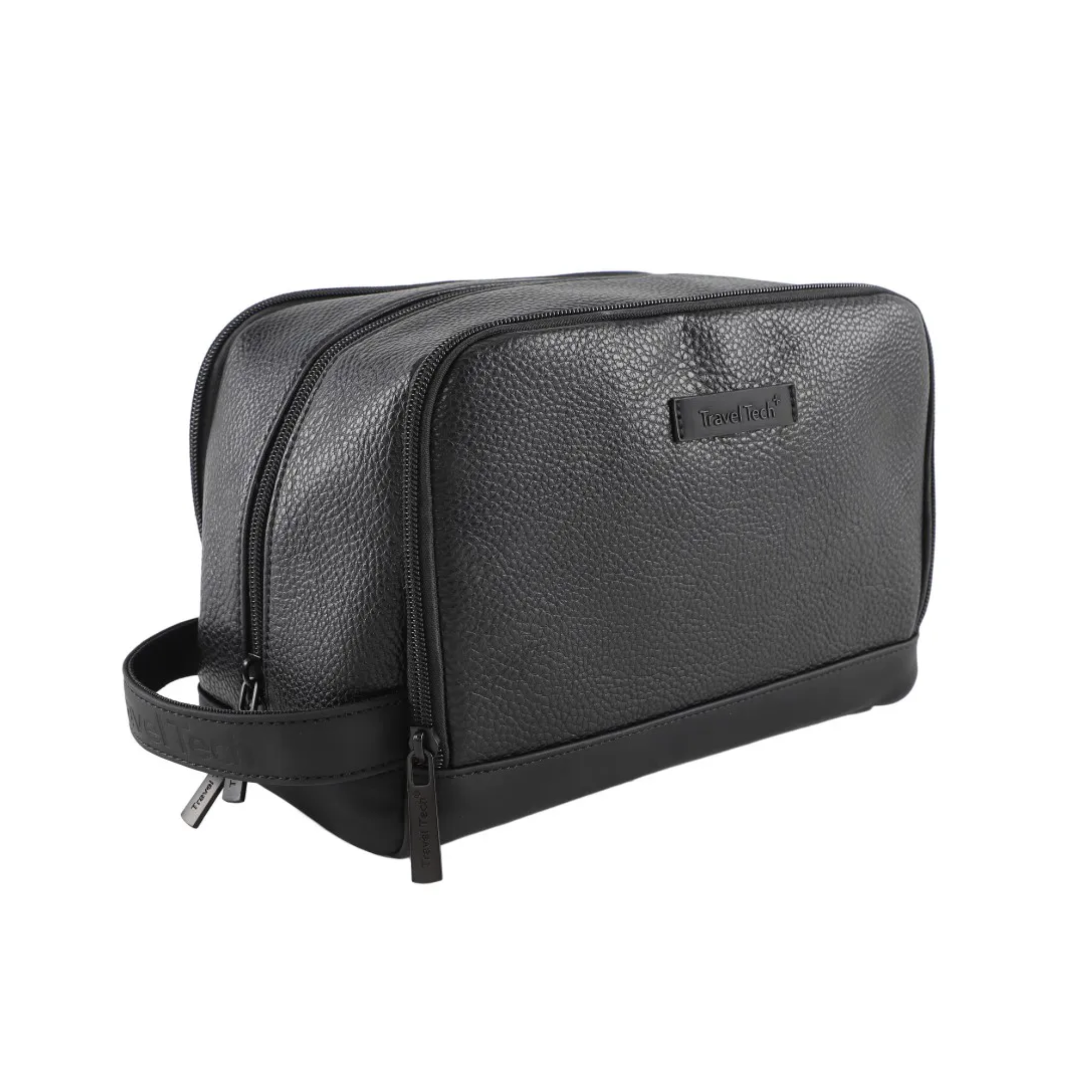 Neceser TRAVEL TECH de eco cuero graneado, con tres divisiones, faja sujetadora y base de goma antideslizante.