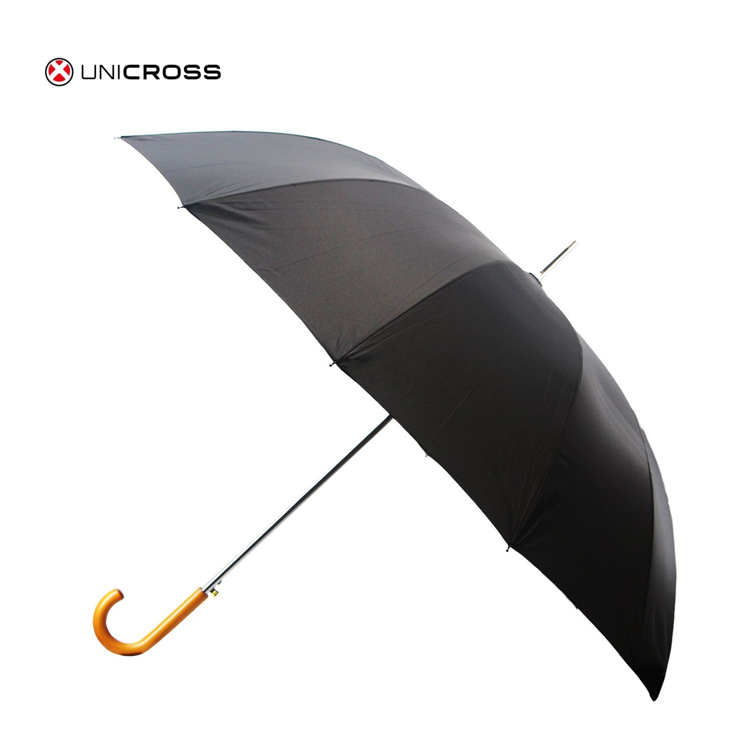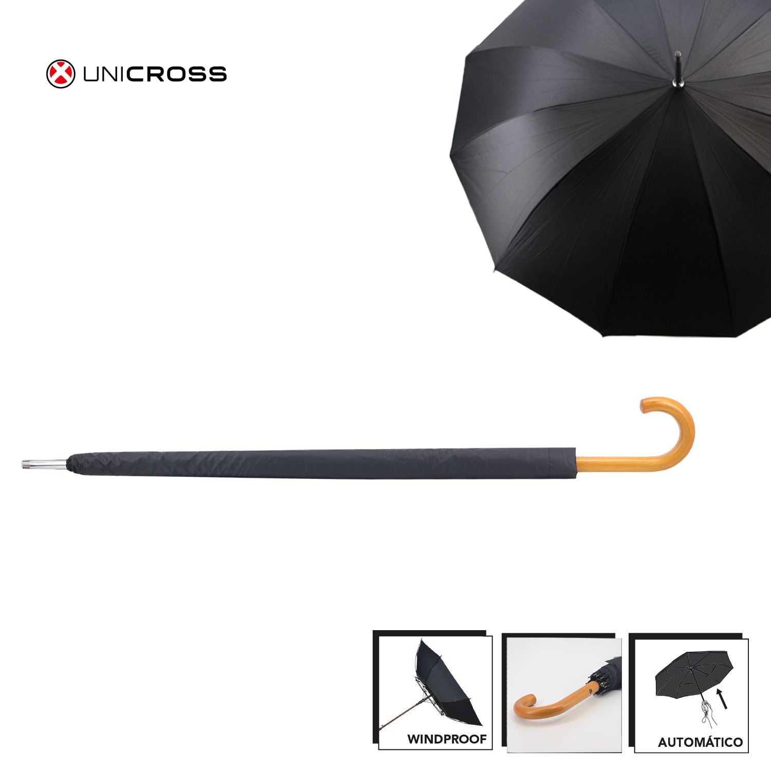 Paraguas Unicross 19″ automático con 16 varillas de PVC flexibles, sistema antiviento y mango símil madera.