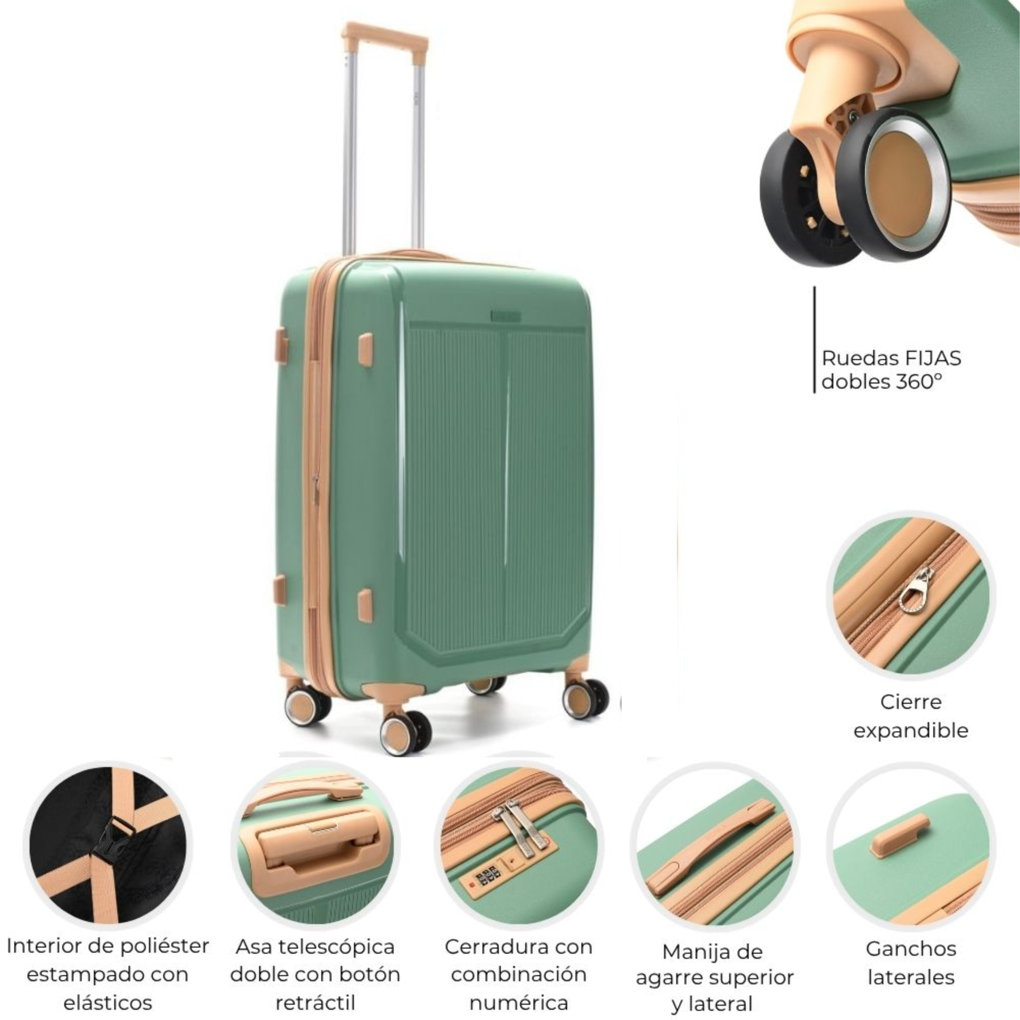 Valija mediana SKORA de viaje, 100% polipropileno, con expansión, candado con combinación, cuatro ruedas dobles giratorias y forro interior.