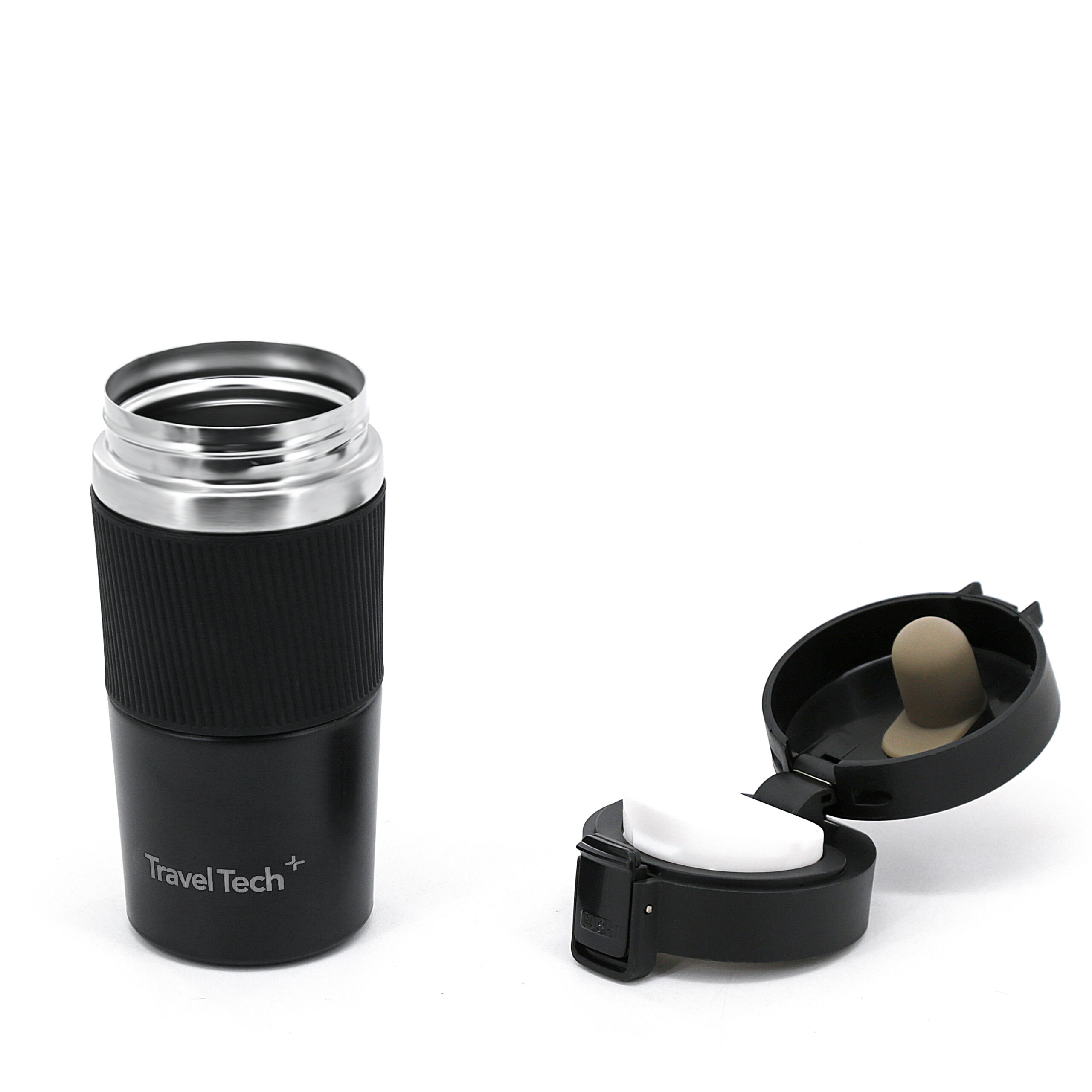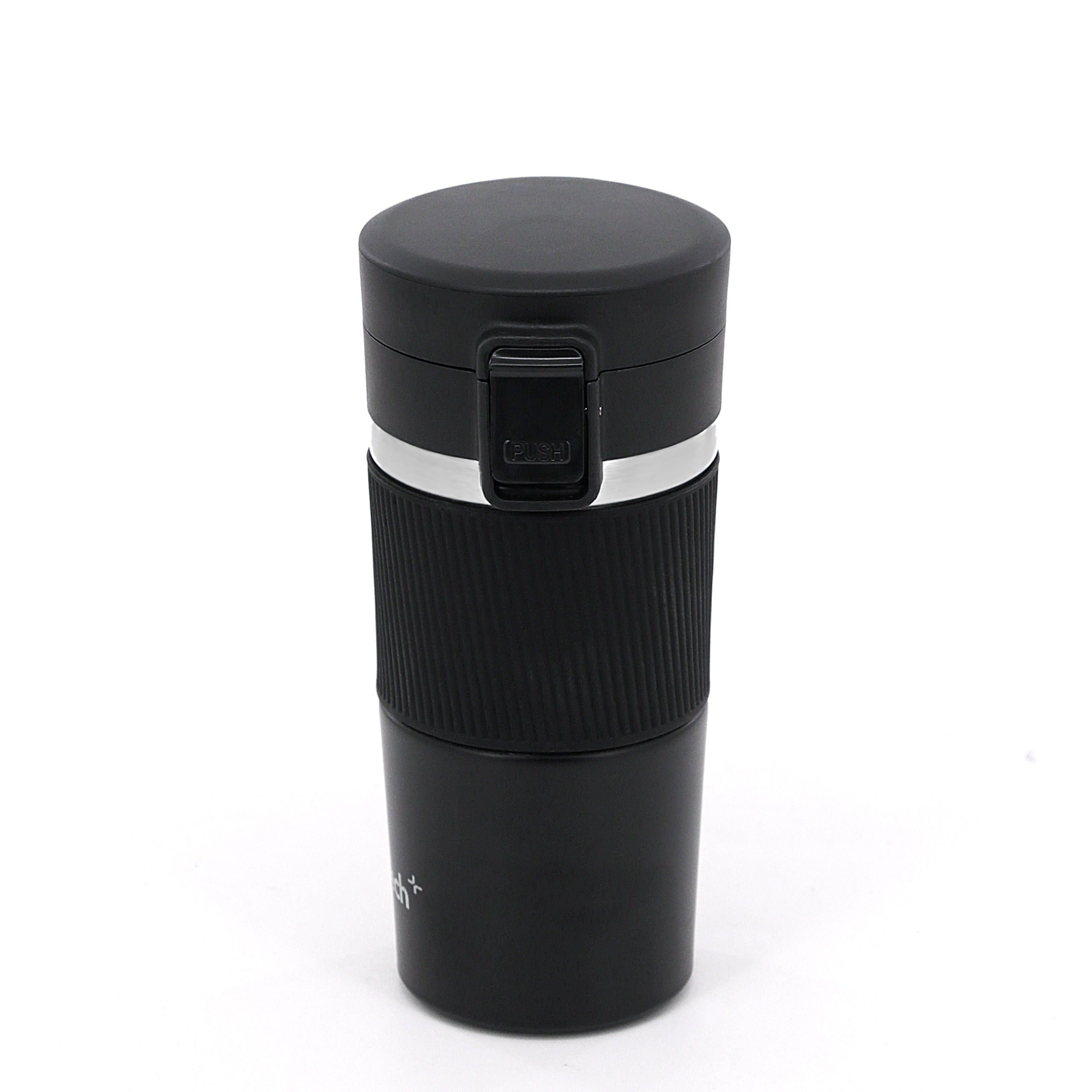 Vaso cafetero térmico de 400 ml en acero 304, con tapa anti-vuelco y faja de goma antideslizante.